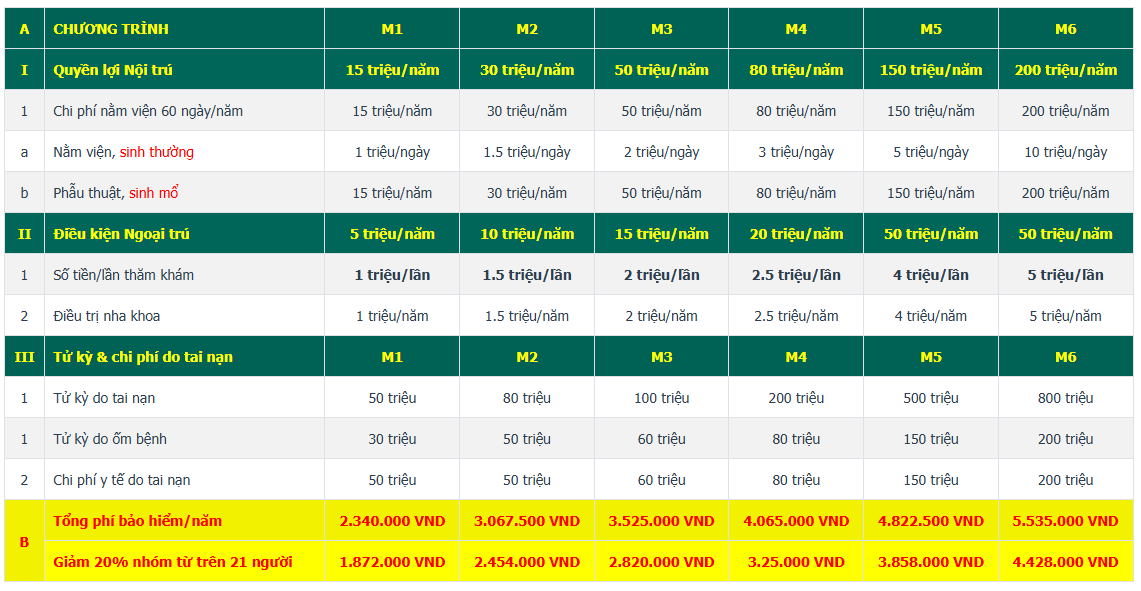 | Phí bảo hiểm | 1 người | 0 đ |