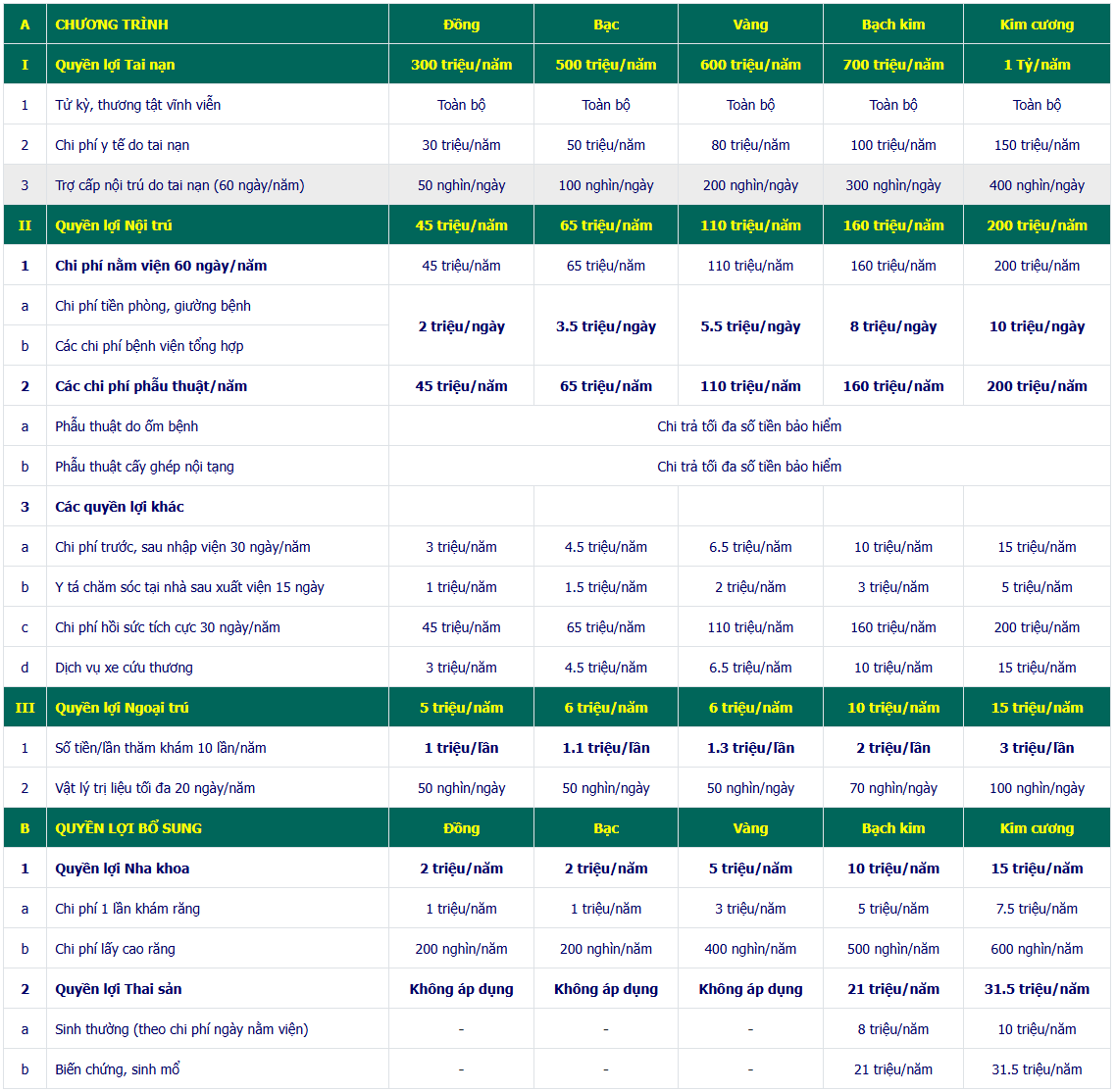 | I | Quyền lợi Tai nạn | 300 triệu/năm | 500 triệu/năm | 600 triệu/năm | 700 triệu/năm | 1 Tỷ/năm |